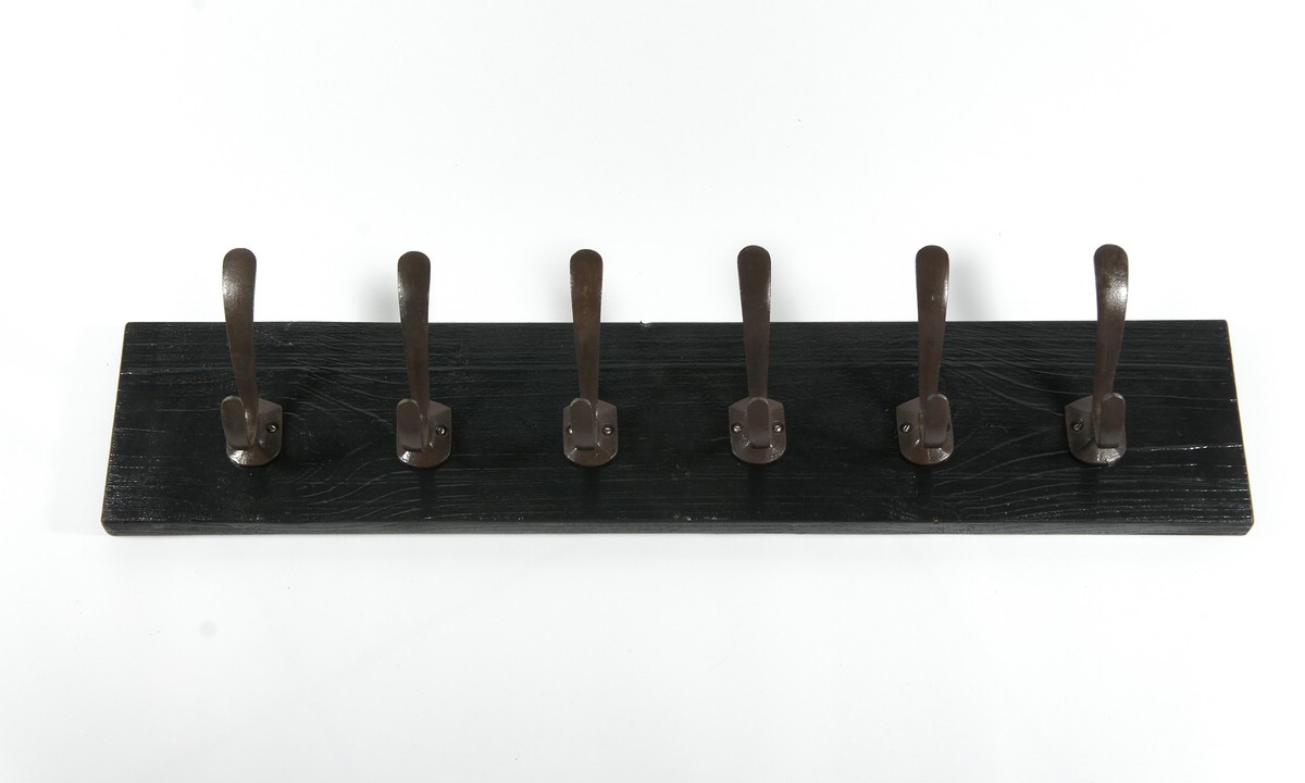 Breit geschwungenes JCB Hakenmodell. Der robuste Kleiderhaken ist in Eisen antik gefertigt und bietet vertikal übereinander eine doppelte Aufhängemöglichkeit für z. B. einen Schal und eine Jacke. Mehrere dieser Eisenhaken sind sehr schön nebeneinander aufhängbar.